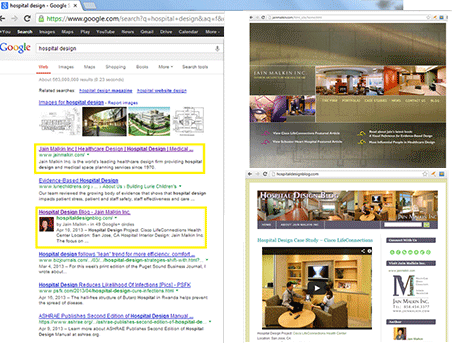 RESULTS:  After 6 months of using our SEO  services, Web Reputation Builders obtained 1st page rankings for all of the client’s target  keywords (including “hospital interior design”  and “healthcare interior design”) and as a  result, Jain Malkin Inc. saw a dramatic  increase in the number of calls and e-mails  that came from the internet.