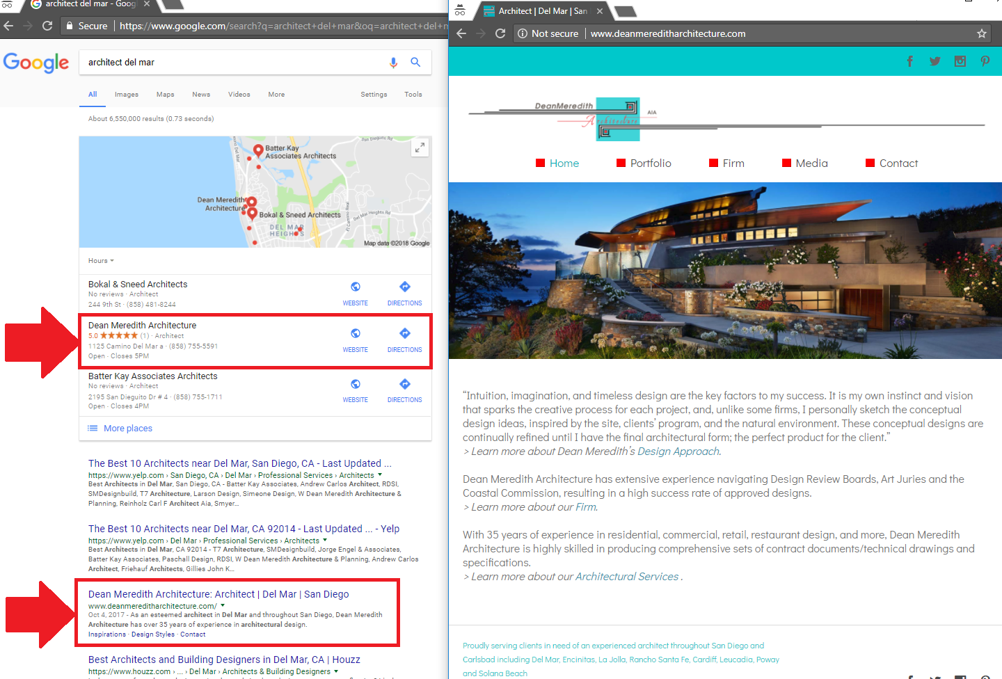 RESULTS:  After 5 months of launching Dean Meredith Architecture’s SEO campaign, Web Reputation Builders  obtained #1 rankings for most of the client’s  target keywords (including the highly – competitive keyword “Architect in Del Mar”)