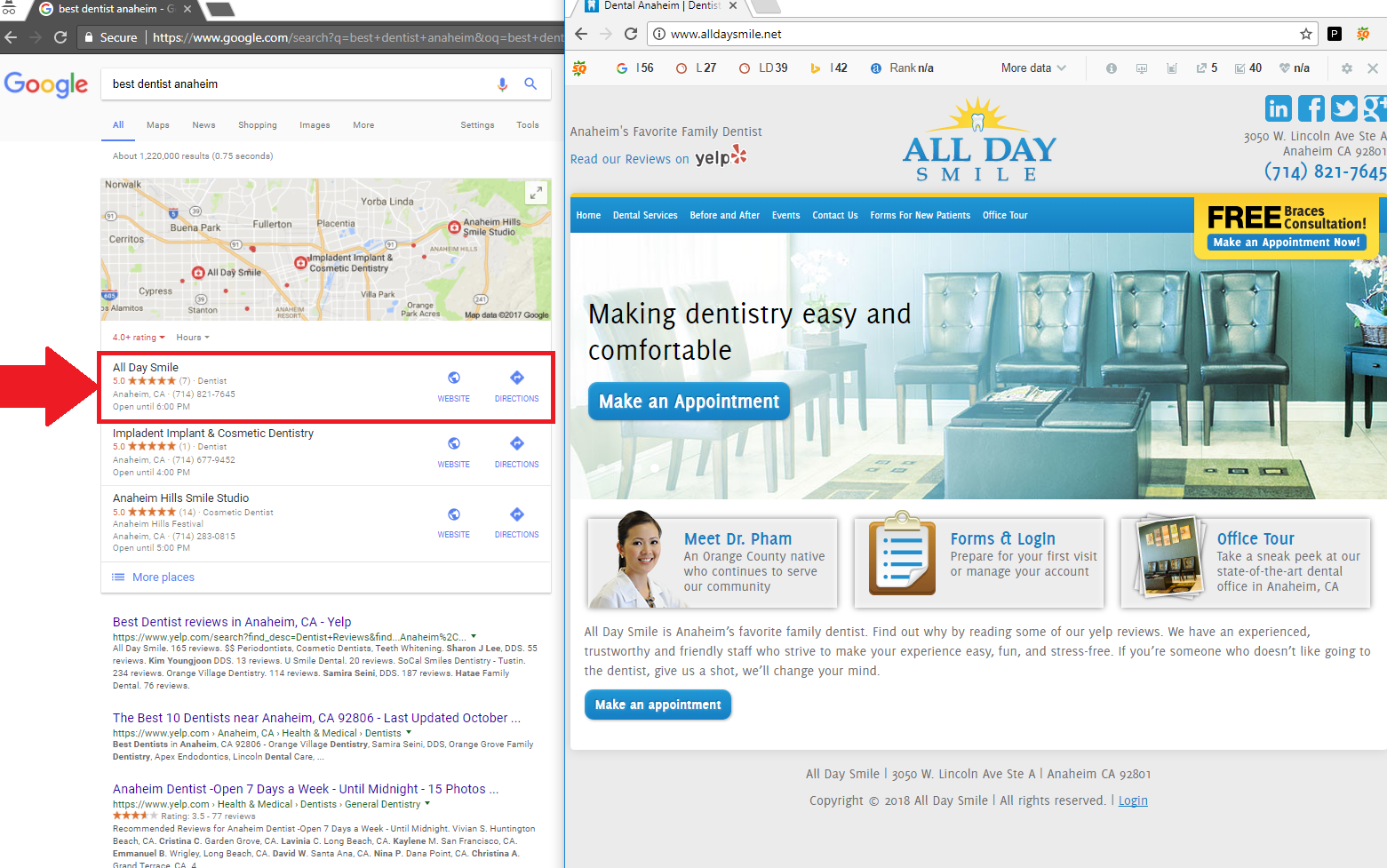 RESULTS:  After 4 months of launching All Day Smile’s SEO campaign, Web Reputation Builders  obtained #1 rankings for most of the client’s  target keywords (including the highly – competitive keyword “Best Dentist in Anaheim”)