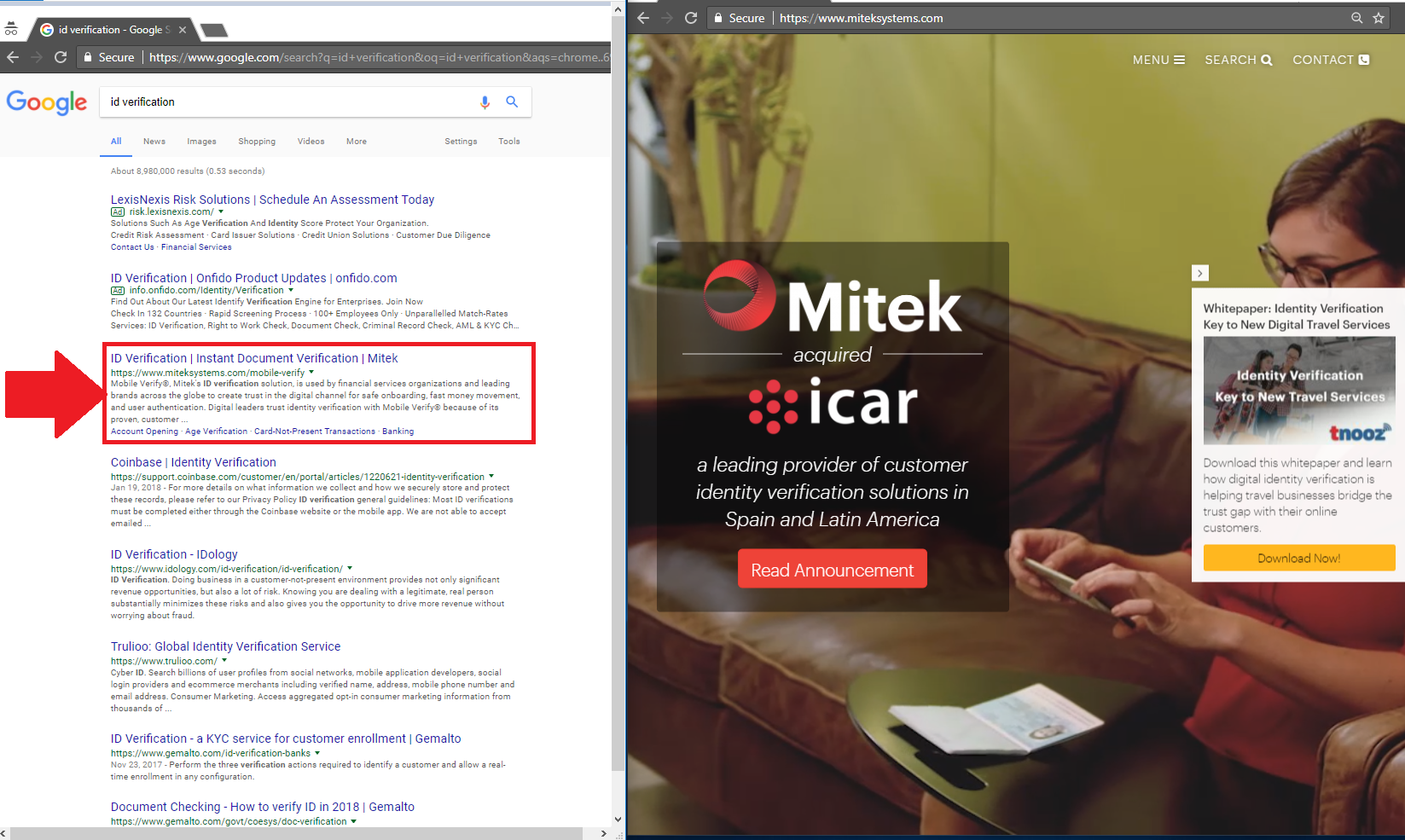 RESULTS:  After only 6 months of consulting for Mitek’s marketing team, Web Reputation Builders achieved #1 ranking for Mitek’s top priority keyword “ID Verification” which is an essential component of their business. We have had a fruitful, long-term relationship consulting for Mitek for over 2 years and continue to expand on their target keyword rankings and help improved their overall website traffic.